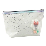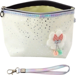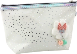 Torbica je opremljena pouzdanim patentnim zatvaračem i udobnom ručkom s karabinerom, što omogućuje lako pričvršćivanje na ruksak ili nošenje oko zapešća. Ukrašena je svilenom mašnom i pomponom koji dodaju moderan šarm, a površina sa šljokicama blista na svjetlu stvarajući atraktivan i suvremen izgled.
