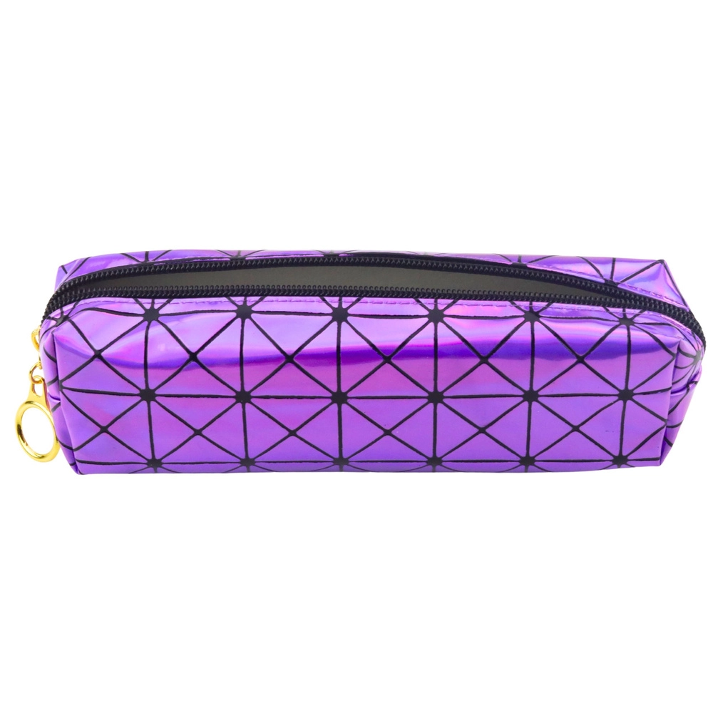 Ljubičasta holografska pernica moderan je dodatak za školske i uredske potrepštine, koja zahvaljujući svojoj blistavoj završnoj obradi i geometrijskom uzorku odmah upada u oko. Kompaktne dimenzije i vitak oblik čine je idealnom za pohranu osnovnih pribora za pisanje kao što su kemijske olovke, olovke ili markeri.
