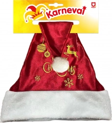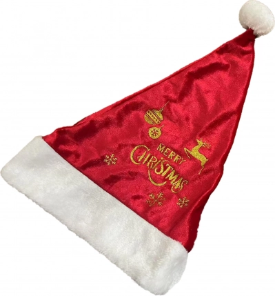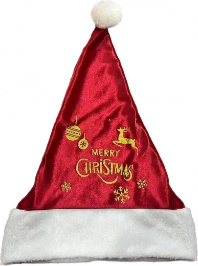 Ova elegantna božićna kapa izvrstan je dodatak za sve božićne prigode. Njezina crvena osnova ukrašena je dekorativnim zlatnim tiskom koji privlači pažnju. Bijela pompona na vrhu daje kapi tradicionalan izgled.
