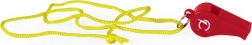 Crveni plastični zviždaljak pričvršćen na žutu vrpcu, idealan za signalizaciju ili sportske aktivnosti.