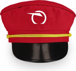 Stilska crvena kapa s logotipom Željezničkog poduzeća Slovačka, crnim sjajnim šiltom i žutom uzicom. Idealna za igru otpravnika.