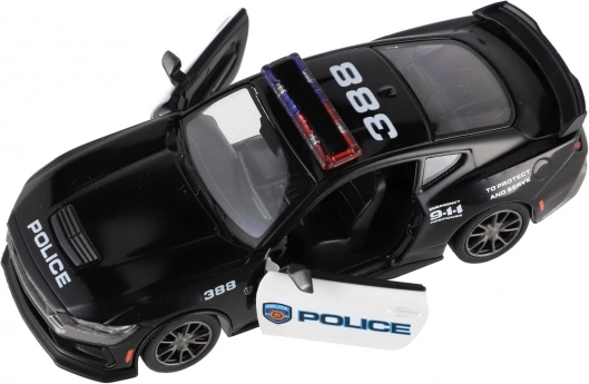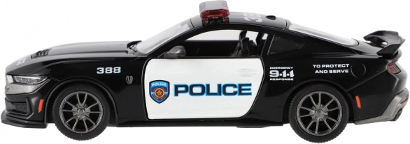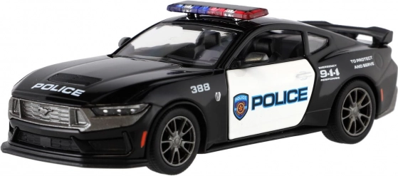 Stilski policijski automobil za male vozače i kolekcionare! Detaljno izrađen model FORD MUSTANG DARK HORSE 2024 u Police izdanju u mjerilu 1:38 nudi metalnu izvedbu, povratno namatanje (pull-back) za brzu vožnju naprijed i otvarajuća vrata za realističnu igru. Duljina vozila 13 cm, prikladno za djecu od 3 godine.