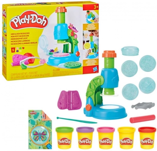 Igraći set Play-Doh Mikroskop osmišljen je za poticanje znatiželje i kreativnosti djece. Svjetleći mikroskop daje plastelinskim kreacijama živopisan efekt: dovoljno je napuniti prozirna stakalca plastelinom i pritisnuti mikroskop prema dolje.