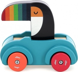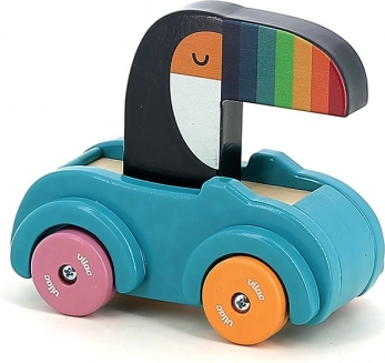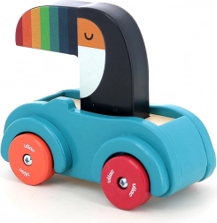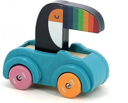 Drveno autić s trubom idealna je igračka za malu djecu. Zahvaljujući raznobojnim kotačima i tukanovu šarenom kljunu, privlači pažnju i potiče maštovitu igru. Truba, koja zatrubi kada se pritisne tukanova glava, pruža interaktivno iskustvo za mališane, potiče njihov interes i poboljšava koordinacijske vještine.