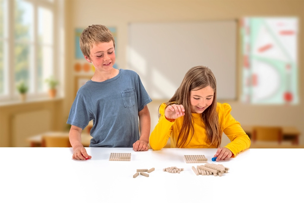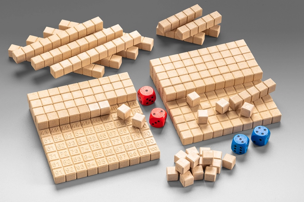 Sadržaj pakiranja uključuje: dvije ploče s brojevima, 22 štapića po deset, 6 štapića po pet, 28 jedinica kockica, crvene i plave kocke te upute na više jezika. Igra je prikladna za individualni i grupni rad.