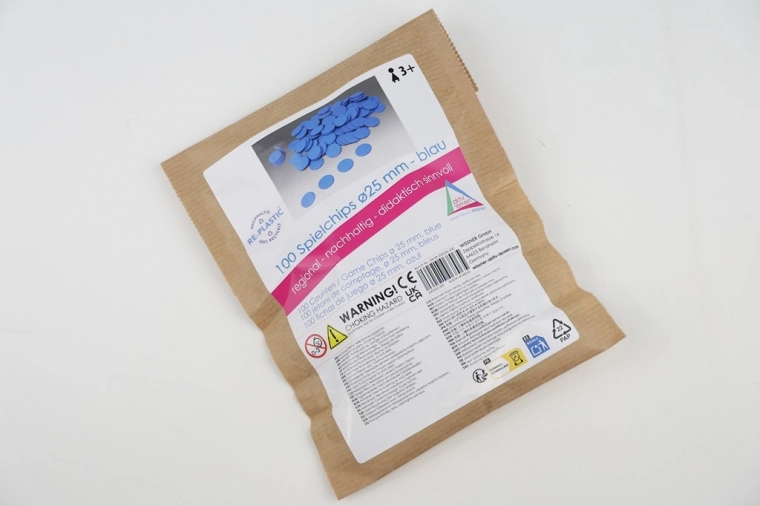 Žetoni su proizvedeni u Njemačkoj i pakirani u ponovno zatvorivu papirnatu vrećicu s FSC certifikatom, što osigurava odgovoran pristup prirodi. S promjerom od 2,5 cm lako ih mogu hvatati i mala djeca.