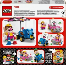 Doživite brze utrke, oštre driftove i uzbudljive dvoboje školjkama. Set donosi 2 lika – Wario i King Boo – te detaljno izrađene modele kartinga Badwagon i Teddy Buggy s funkcionalnim kotačima. Badwagon dodatno ima odvojivo jedrilo koje se može postaviti i na Teddy Buggy, pa tijekom igre možete glatko prelaziti između vožnje i „letenja“.