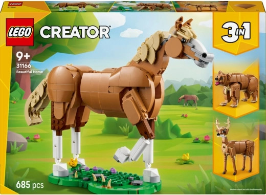Otkrijte neograničene mogućnosti gradnje sa setom Creator 3 u 1: prekrasan konj. Od jednog kompleta kocaka izgradit ćete pokretnu figuru konja s postoljem koju je moguće postaviti u tri različita položaja: na tri ili četiri noge ili impresivno na stražnjima. Svi modeli odlikuju se detaljnom izradom i izvrsni su i za igru i za izlaganje u dječjoj sobi.