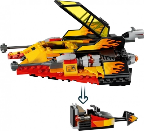 Otvarajući dvostruki kokpit skriva odvojivi speeder – pritiskom na sjedalo ili glavu minifigure speeder odmah lansirate u akciju.