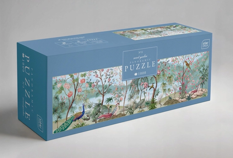Panoramske puzzle Tajni vrt od Interdruka. 1000 dijelova prekrasne slike ptičjeg svijeta. Dimenzije 96 x 32 cm.