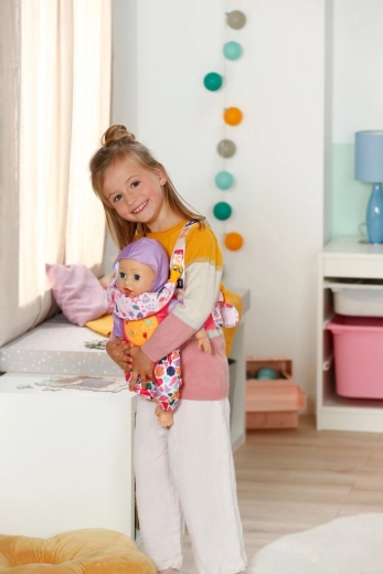 Nosiljka BABY born je mekani i udobni dodatak za nošenje, zahvaljujući kojem djeca mogu nositi svoju omiljenu lutku posvuda sa sobom. Široke i podstavljene naramenice s glatkim podešavanjem lako se prilagođavaju djeci različitih veličina i osiguravaju sigurno i stabilno nošenje. Stil upotpunjuju razigrani kopčajući ukrasi koje je moguće mijenjati prema raspoloženju, te praktična kutijica za njihovu pohranu.