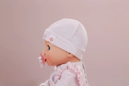 Upoznajte lutku BABY born Annabell 43 cm – mekanu prijateljicu za svakodnevnu igru i maženje. Zahvaljujući elektroničkim funkcijama realistično pomjera usnice, otvara i zatvara oči, reagira na dudu i hranjenje iz bočice, može se uspavati ljuljanjem te iznenađuje i smiješnim zvukovima pri škakljanju ili vježbanju “bebi gimnastike”.