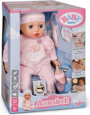 Annabell veličine 43 cm ima mekano tjelešce idealno za zagrljaje i nježnu igru. Interaktivna tehnologija osigurava prirodne reakcije – pri sisanju dude ili pijenju iz bočice pomjera usnice te ovisno o situaciji zatvara ili otvara oči. Zahvaljujući umirujućem ljuljanju lako je uspavate u čak dva smjera.