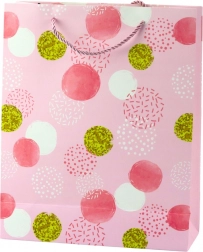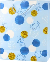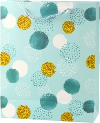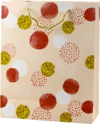 Točkice različitih veličina, neke sa sjajnim efektom ili dekorativnim tiskom, daju cjelini originalan i efektan karakter. Vrećica je izrađena od izdržljivog laminiranog papira otpornog na savijanje, što omogućuje sigurno pakiranje i težih darova.