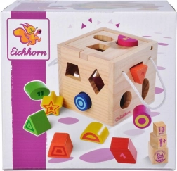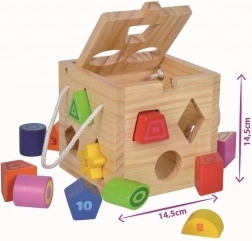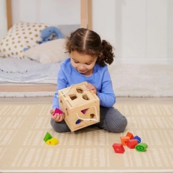 Ova drvena otvarajuća kocka nudi klasičnu igru prepoznavanja oblika. Djeca umeću pojedine dijelove u odgovarajuće otvore i vježbaju koordinaciju oko–ruka, logičko razmišljanje i koncentraciju. Zahvaljujući živim bojama, učenje je prirodno zabavno.