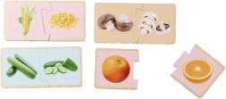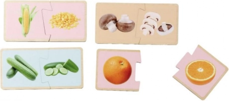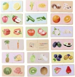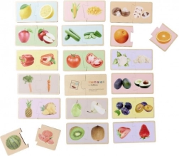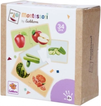 Drvene Montessori slagalice s motivom voća i povrća uče djecu ispravno sparivati odgovarajuće dijelove i imenovati pojedine vrste namirnica. Realistične ilustracije pomažu povezati igru sa svakodnevnim životom i podupiru prirodno učenje kroz igru.