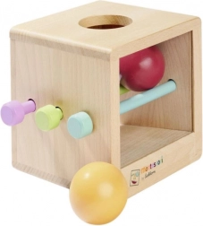 Montessori kutija je svestrana drvena edukativna igračka od 100% bukovine s FSC certifikatom. Kutija s prozorom, 3 štapića i 2 obojene kugle omogućuju podesivu razinu težine – sa štapićima se kugle zaustavljaju unutra, bez štapića odmah se otkotrljaju van. Podržava finu motoriku, koordinaciju oko–ruka i razumijevanje uzroka i posljedice. Prikladno od 1. godine.