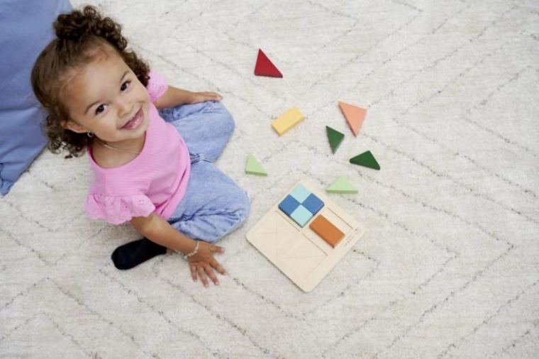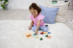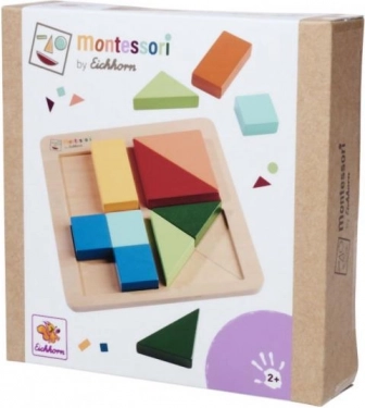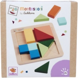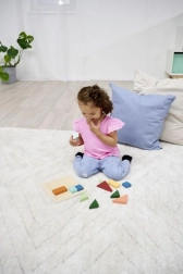 Ova montessori slagalica donosi djeci zabavan izazov: posložiti raznolike oblike tako da ispune površinu kvadrata. Dijelove je moguće slobodno miješati između kvadrata i stvarati nove kombinacije boja, što produžuje igrivost i potiče kreativnost.