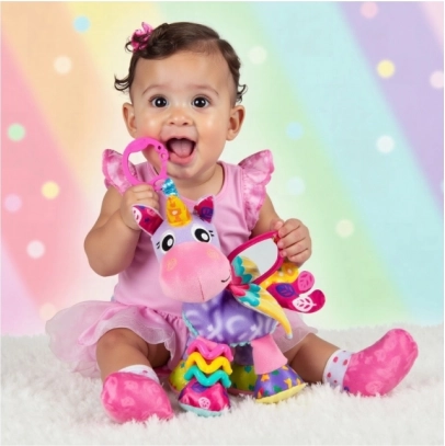 Slatki jednorog Stella od Playgroa mekana je viseća igračka za najmlađe koja potiče razvoj osjetila i zabavlja na putovanjima i kod kuće. Nudi zrcalce za samootkrivanje, šuškave i zveckajuće elemente, različite teksture i kontrastne uzorke za stimulaciju vida, dodira i sluha. Zahvaljujući praktičnom C klipsu lako je pričvrstite na kolica, autosjedalicu ili krevetić.