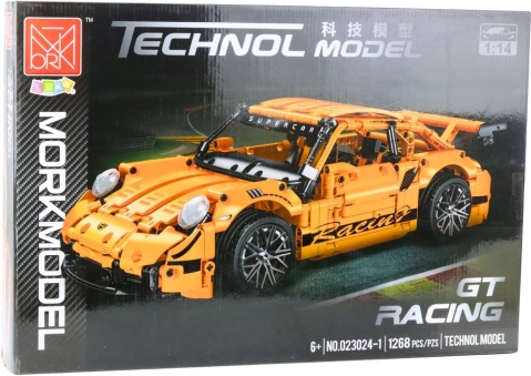 Konstruktorski set GT Racing 1:14, 1268 dijelova. Otvarajuća vrata, podesiv spojler, izdržljiv ABS materijal. Realističan sportski model u narančastoj.