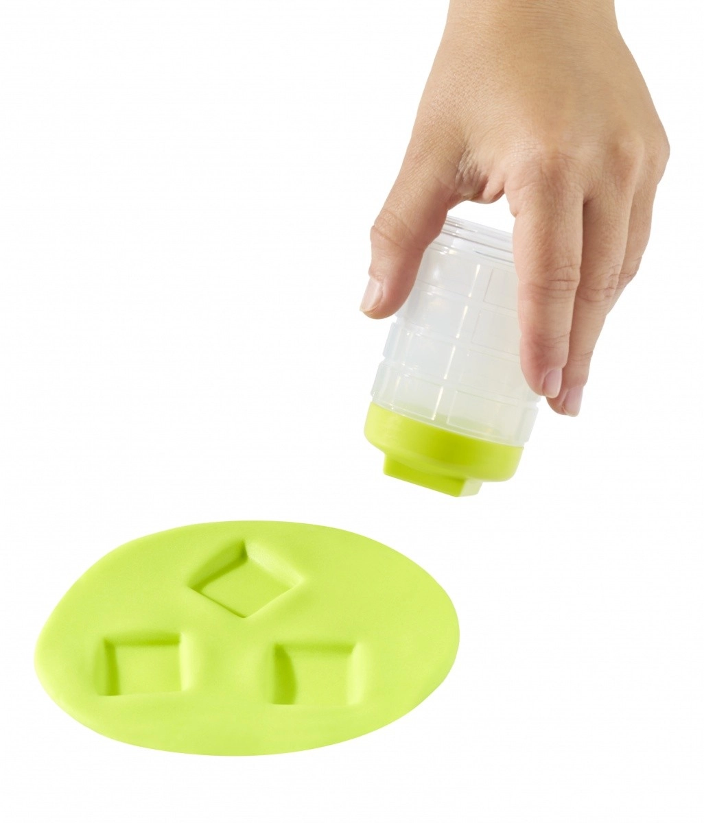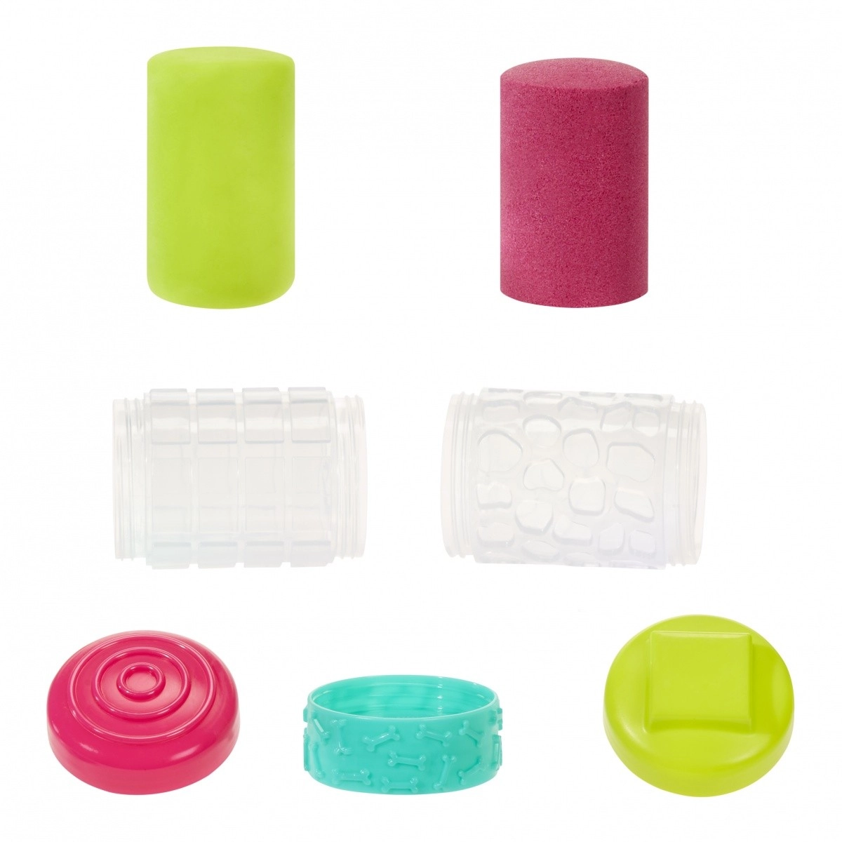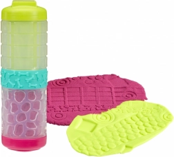 Dio seta je multifunkcionalni alat 4 u 1 s izmjenjivim nastavcima za valjanje i utiskivanje uzoraka. Održiv i pametan dizajn pakiranja ujedno služi kao dio igre: poklopci rade kao žigovi, a spojka kao teksturirani valjak. Možete kombinirati masu s pijeskom i stvoriti novu smjesu jedinstvene haptike koja potiče osjetilnu percepciju i kreativnost.
