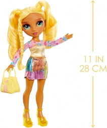 Sunny iz RAINBOW HIGH samouvjerena je modna muza koja nadahnjuje djecu da izraze vlastitu individualnost. Njezin outfit spaja sjajno žute i dugine akcente – upadljiv top, bezvremensku suknju, elegantne salonke i torbicu u tonu. Kosa oblikovana u razigrane pletenice potiče kreativnost pri češljanju.