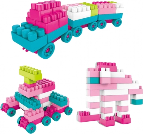 Ovaj bogati set potiče razvoj mašte, kreativnosti i fine motorike. Pastelna paleta ružičaste, bijele, tirkizne i svjetlozelene oduševit će male graditeljice i ljubitelje nježnih boja. Dijelovi od izdržljive plastike dizajnirani su za lako držanje i sigurnu igru bez oštrih rubova.