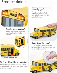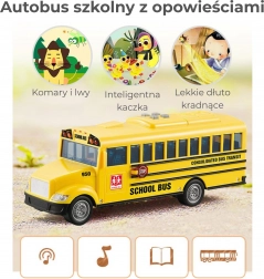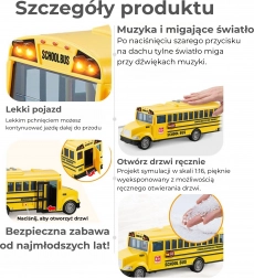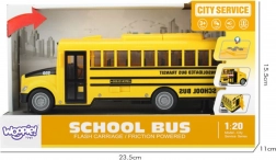 Interaktivni školski autobus WOOPIE u mjerilu 1:20 oduševit će male ljubitelje vozila i gradskog prijevoza. Realistični detalji, prednja svjetla i zvukovi vožnje uvlače djecu u igru, dok otvarajuća vrata potiču kreativne scenarije i igru uloga. Zahvaljujući inercijskom (frikcijskom) pogonu dovoljno je autobus pogurnuti i sam će prijeći nekoliko metara.