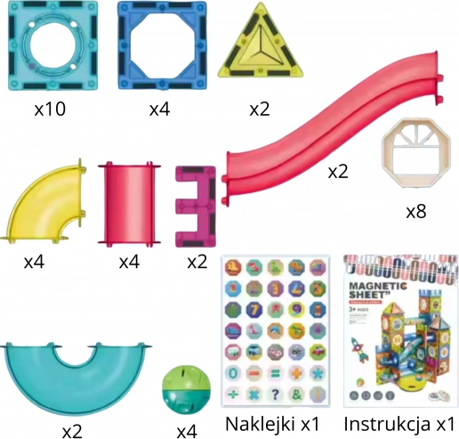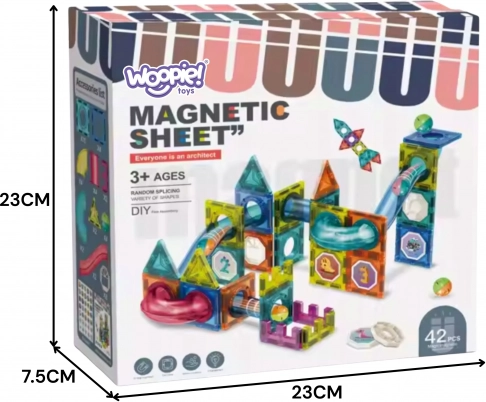 Set sadrži 42 komponente, uključujući magnetne pločice i oblikovane segmente staze, zahvaljujući kojima je moguće stvarati raznolike, stabilne i zabavne konstrukcije. Dijelovi se lako i čvrsto spajaju pomoću snažnih magneta, pa su izvedivi i odvažniji projekti.