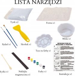 - Kompletno pakiranje – kalupi, gips, boje, kistovi i alati uključujući zdjelicu za miješanje.