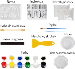 - Sve u pakiranju: kalupi, gips, zdjelica, žličica, paleta, 6 boja, kist, špatula, upute