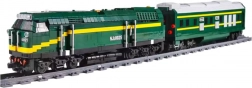 - Zeleno‑žuta lokomotiva s putničkim vagonima