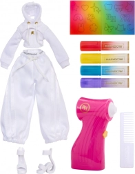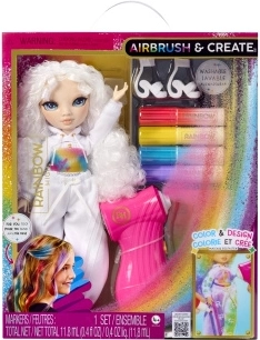 Ova kreativna lutka je poput praznog platna – potpuno u bijelom, s bijelom kosom i outfitom spremnim za vašu maštu. U pakiranju se nalaze četiri periva dužina flomastera (crvena, žuta, plava, ljubičasta) i praktični airbrush za lako sjenčanje i ravnomjerno nanošenje boje.
