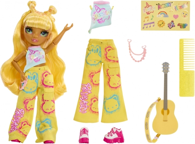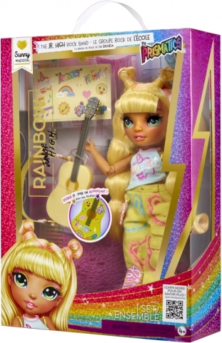 Sunny iz kolekcije Rainbow High Junior Fashion blista kao glavna gitaristica – s dugom žutom kosom, detaljnim make-upom i fleksibilnim zglobovima za realistične poze. Set uključuje outfit s izraženim printovima, stylish tenisice, češalj i žutu gitaru sa zabavnim naljepnicama kako bi djeca mogla prilagoditi izgled po svom.