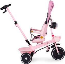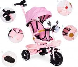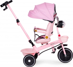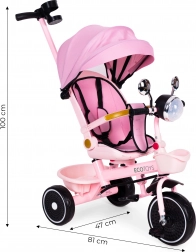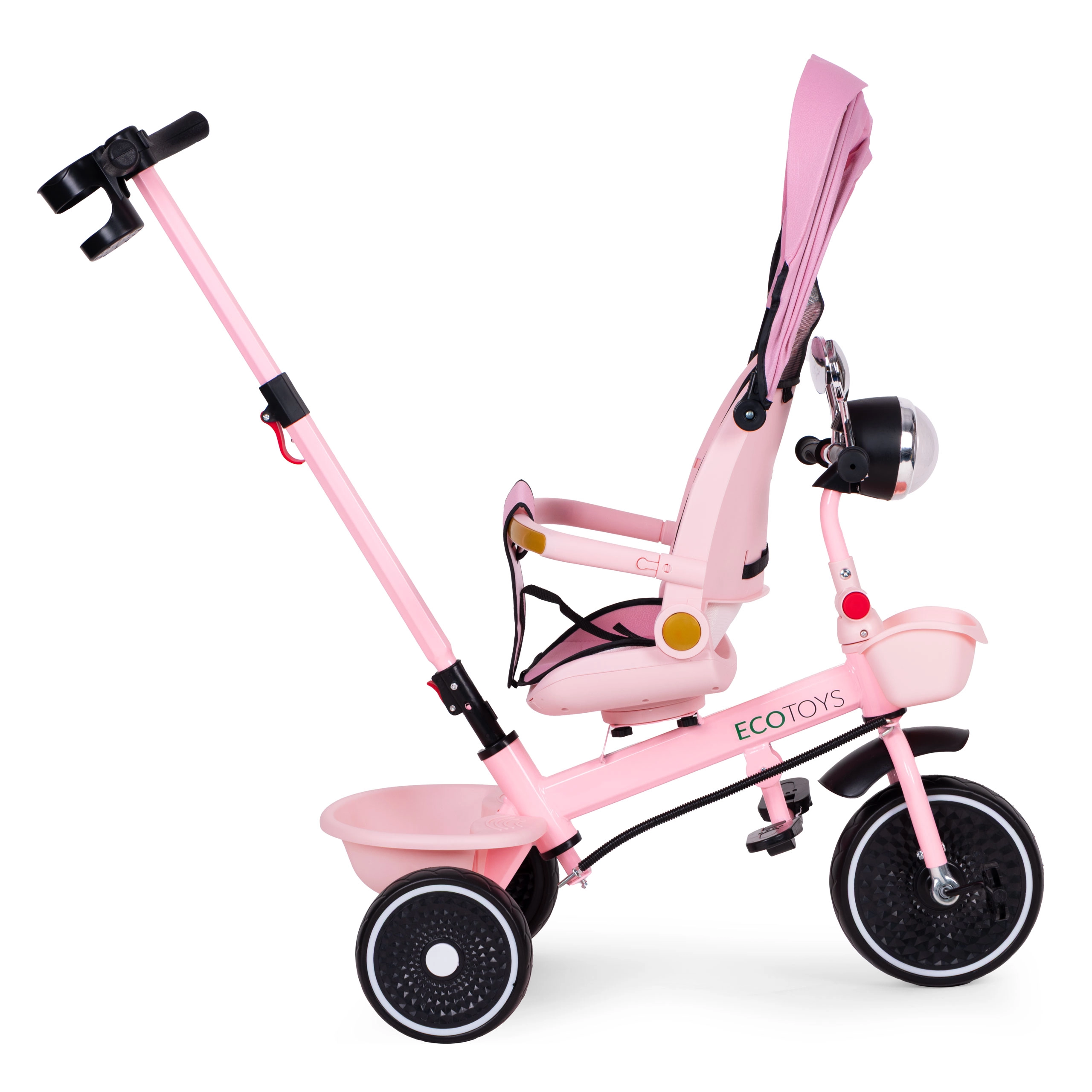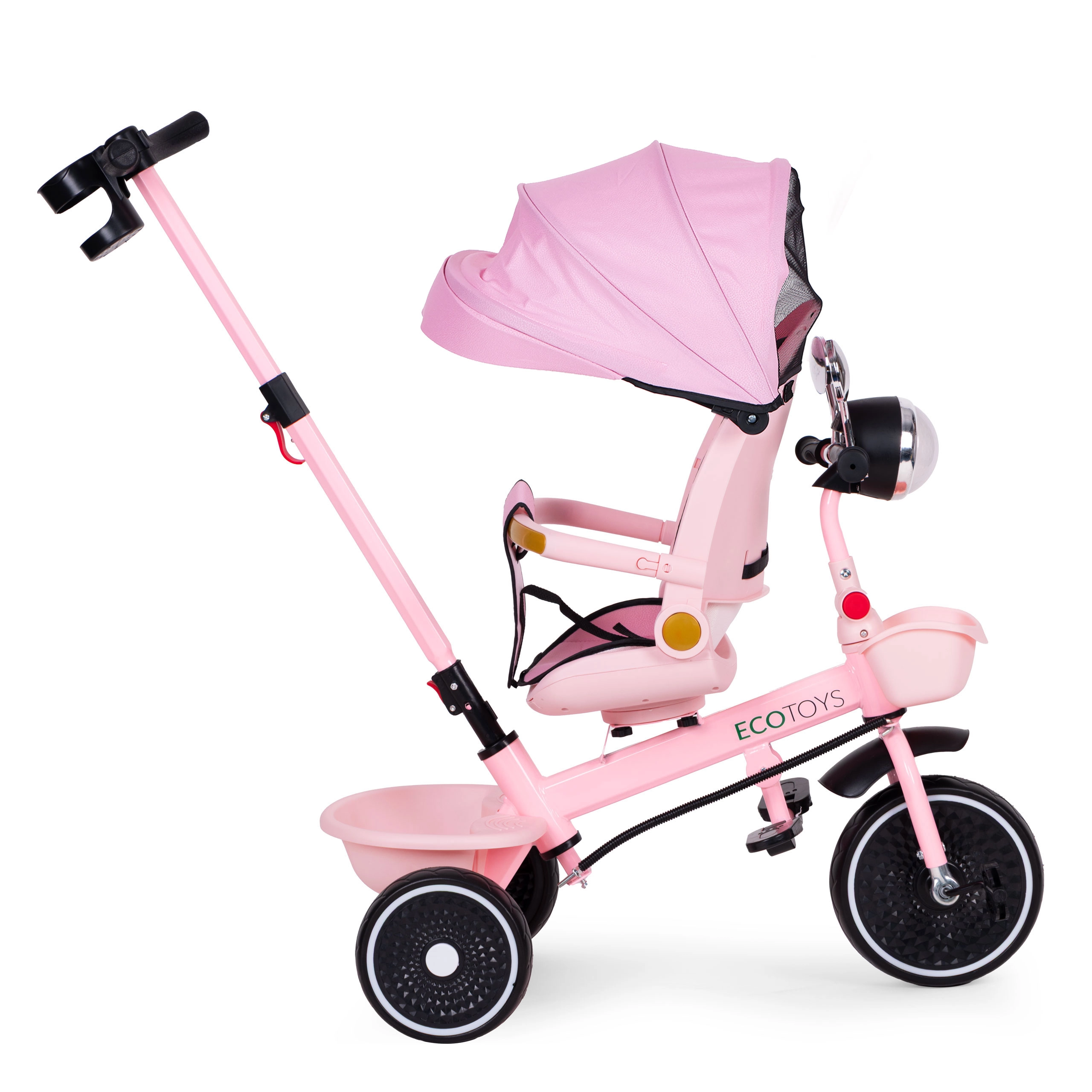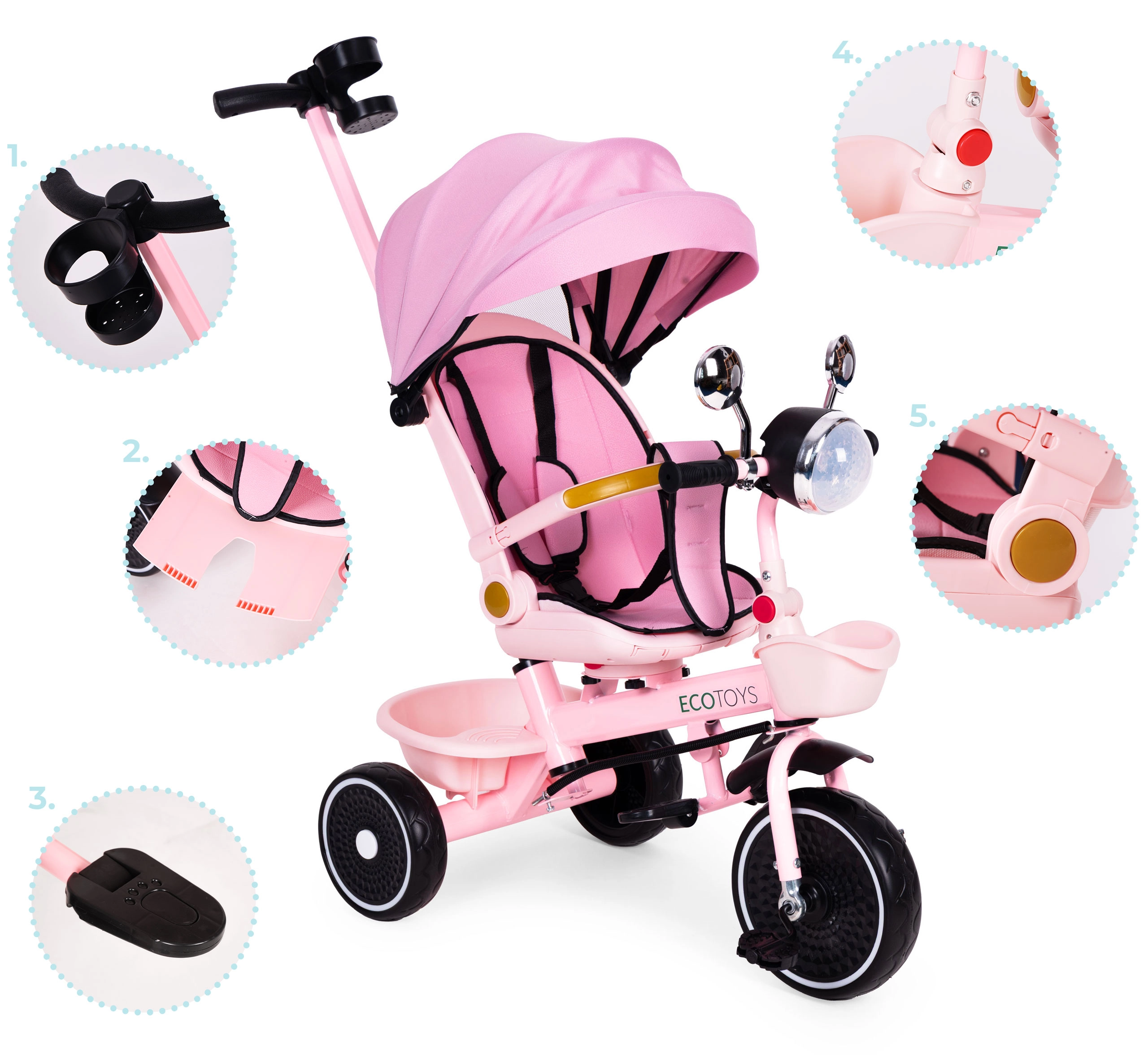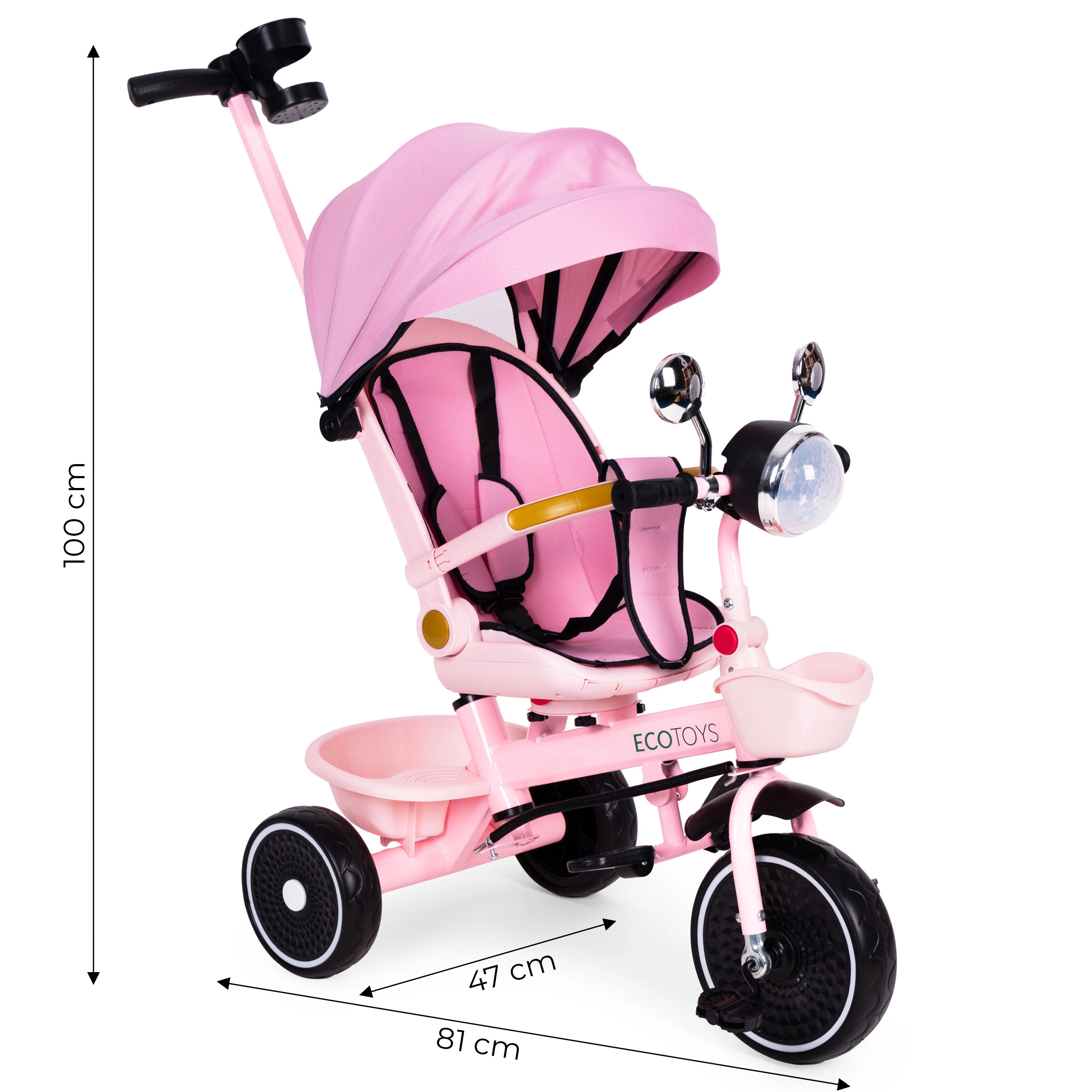 Stilska ružičasta dječja tricikla ECOTOYS spaja udobnost kolica i radost vožnje triciklom. Nudi rotirajuće sjedalo 360°, roditeljsku upravljačku šipku s upravljanjem prednjim kotačem, sklopivu nadstrešnicu, petotočkovni sigurnosni pojas i izdržljive EVA kotače za glatku i sigurnu vožnju od 6 mjeseci do 6 godina.