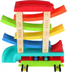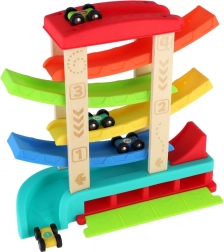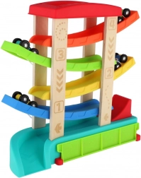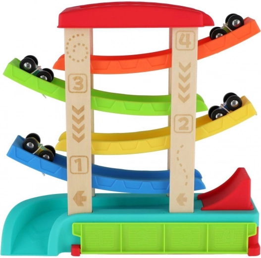 Ova kaskadna trkaća staza spaja čvrste drvene stupove i izdržljive plastične rampe u živim bojama koje potiču dječju znatiželju i vizualnu percepciju. Djeca razvijaju finu motoriku, koordinaciju oko–ruka i razumijevanje uzroka i posljedice promatrajući vožnju autića.