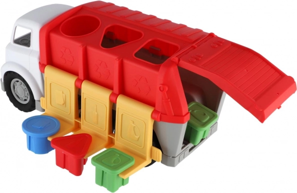 Ovaj šareni kamion za smeće oduševit će male ljubitelje pospremanja i recikliranja. Gornji dio služi kao umetaljka oblika s otvorima u koje djeca umeću odgovarajuće dijelove te uče prepoznavati oblike i boje. Bočna otvarajuća vrata i odvojivi koševi omogućuju zabavnu imitaciju skupljanja otpada.