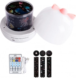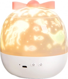 Ovaj dječji projektor s noćnom lampicom stvara umirujuću atmosferu za uspavljivanje i razigranu dekoraciju tijekom dana. Zahvaljujući 6 različitih projekcijskih scenama (rođendan, drveni konjić, Santa, morski dinosaurovski park, raketa i NLO, životinjski park) dijete će svaki dan doživjeti drugu priču. Lampica se lako pretvara iz projektora zvijezda u tiho noćno svjetlo skidanjem unutarnjih membrana i zatvaranjem gornjeg poklopca.