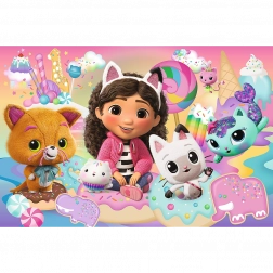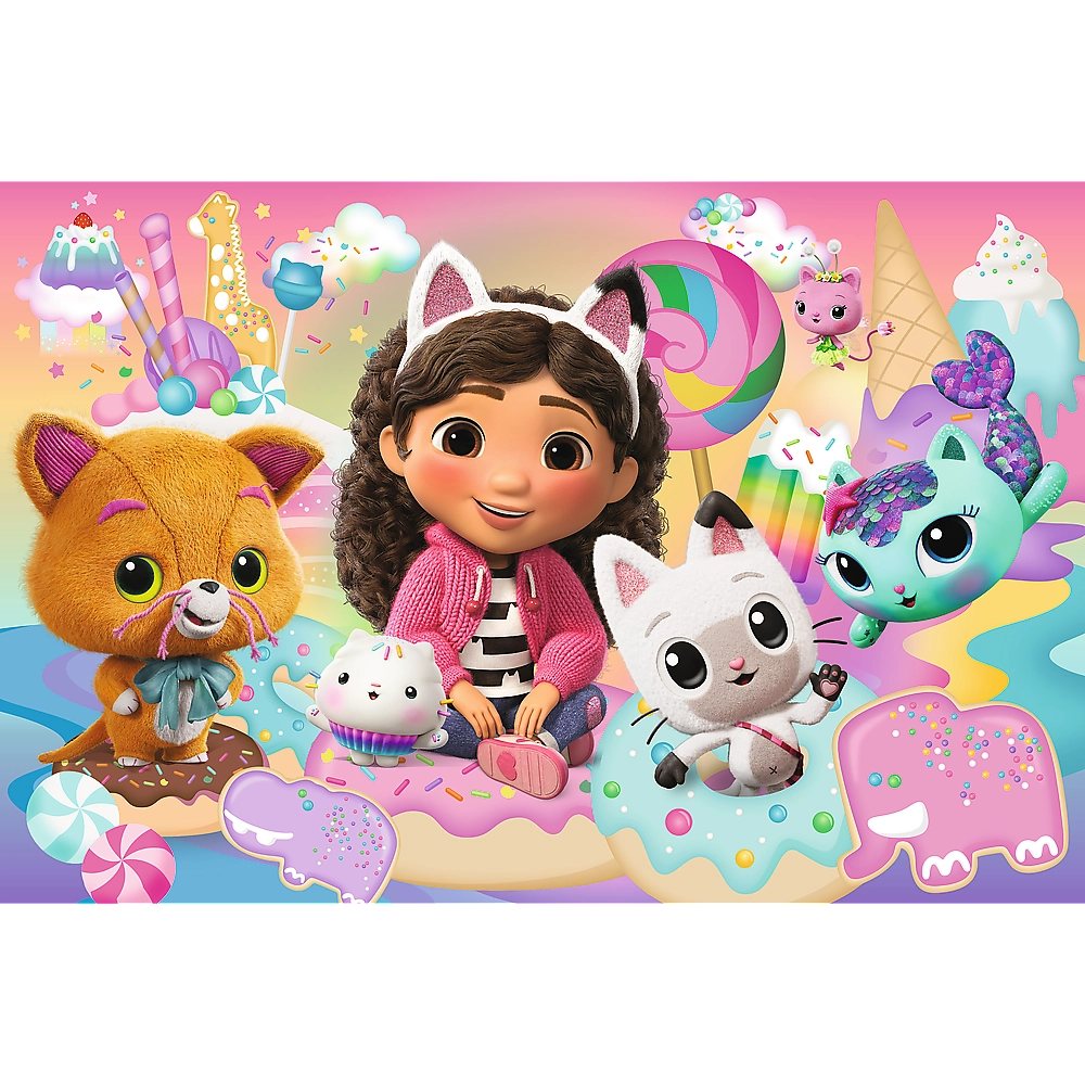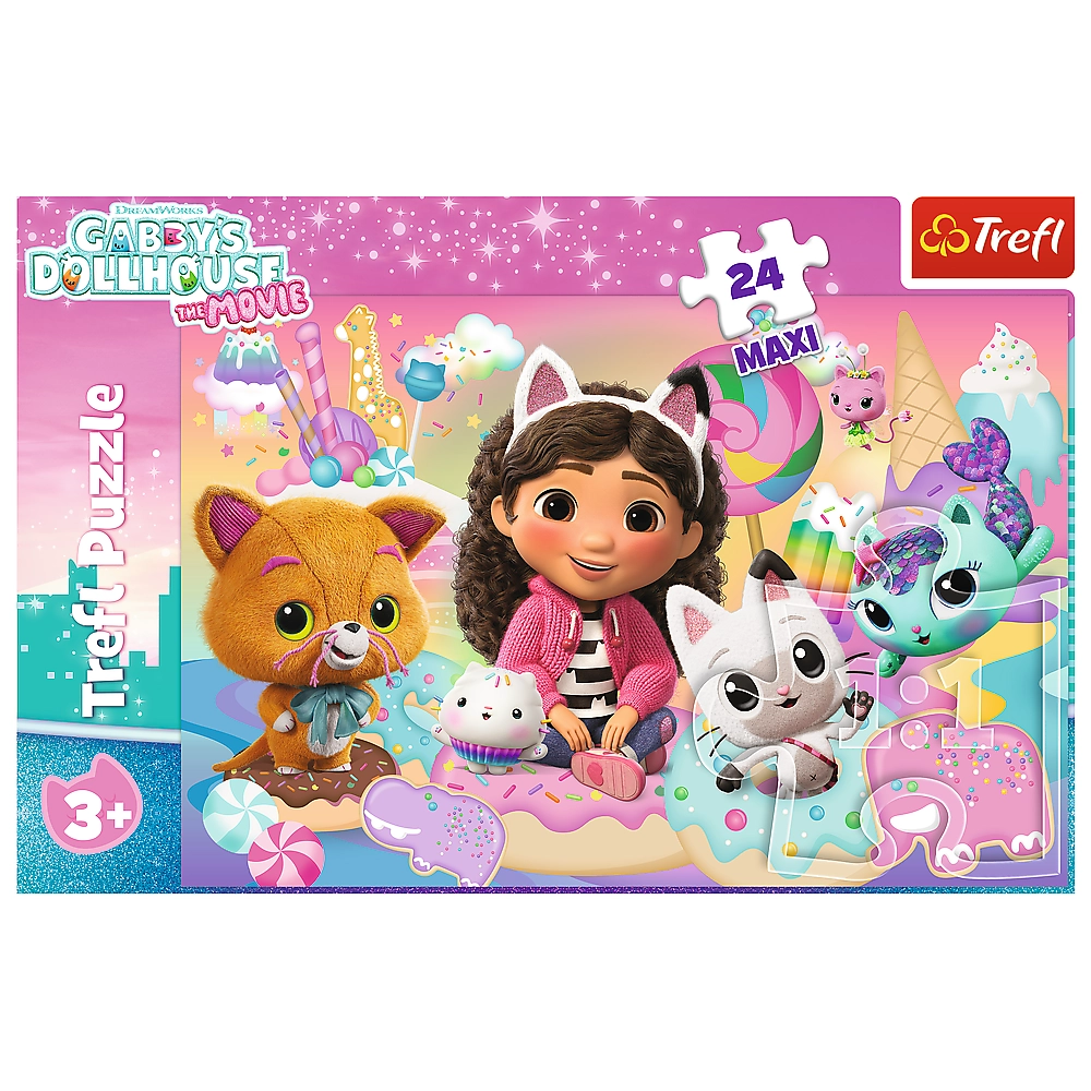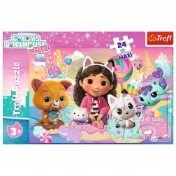 Otkrijte zabavne dječje puzzle s motivom GABBY’S DOLLHOUSE brenda TREFL. Set sadrži 24 ekstra velika dijela, idealna za male ručice i prvo slaganje. Nakon slaganja nastaje slika dimenzija 60 × 40 cm. Kvalitetna izrada, izdržljivi materijali i površina s laganim odsjajem za lakše slaganje razveselit će svakog malog obožavatelja mačjeg svijeta.