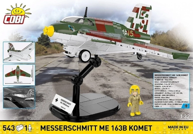 COBI Messerschmitt Me 163B Komet – set 1:32 s 543 dijela, figuricom pilotkinje, otvorivim kokpitom i stalkom. Odličan izbor za fanove WWII.
