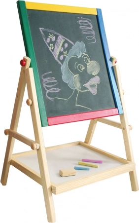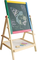 Ova drvena, dvoslojna i multifunkcionalna ploča izvrstan je pomoćnik za svakodnevnu igru i učenje. Djeca mogu vježbati pisanje, crtanje i prve račune na magnetskoj bijeloj strani za suho brisanje ili stvarati kredom na tradicionalnoj crnoj površini. Zahvaljujući prostranoj polici sve su potrepštine uvijek pri ruci.