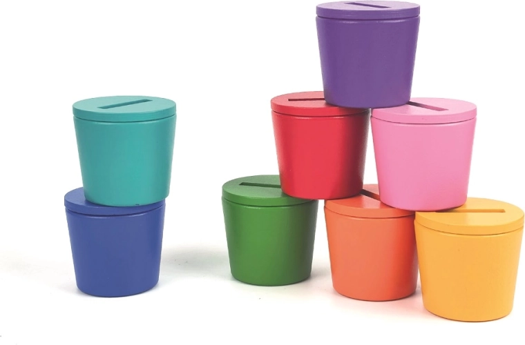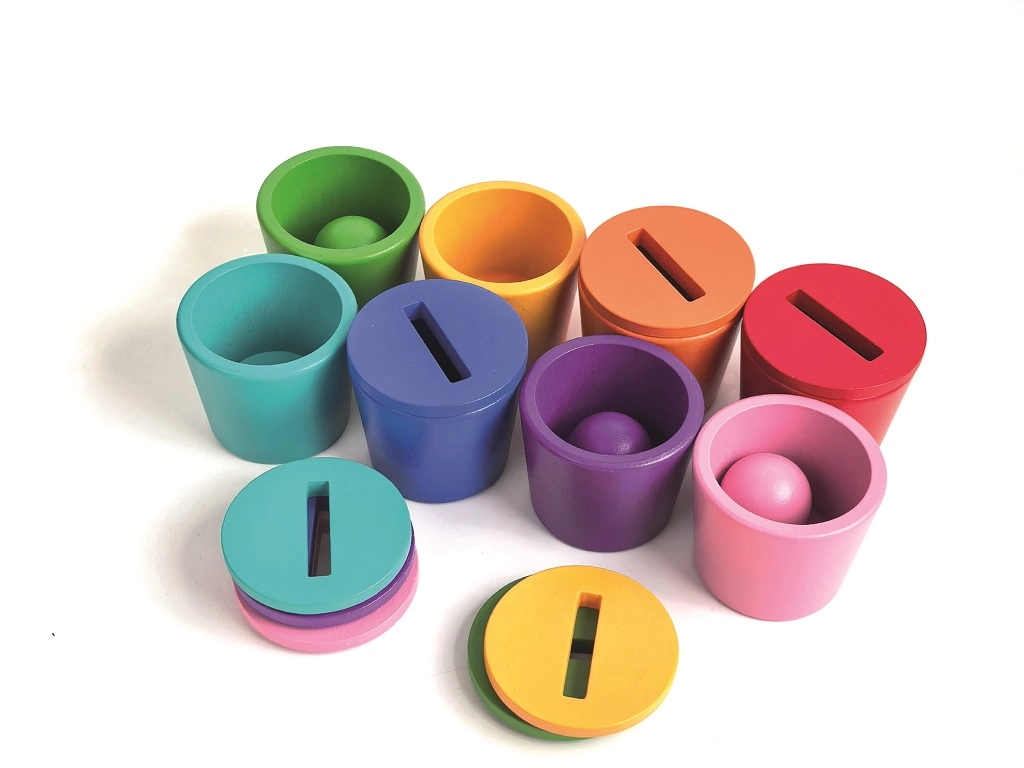 Šarene čašice s poklopcima i prorezima omogućuju ubacivanje diskova, što potiče koncentraciju, strpljenje i razvoj motoričkog planiranja.