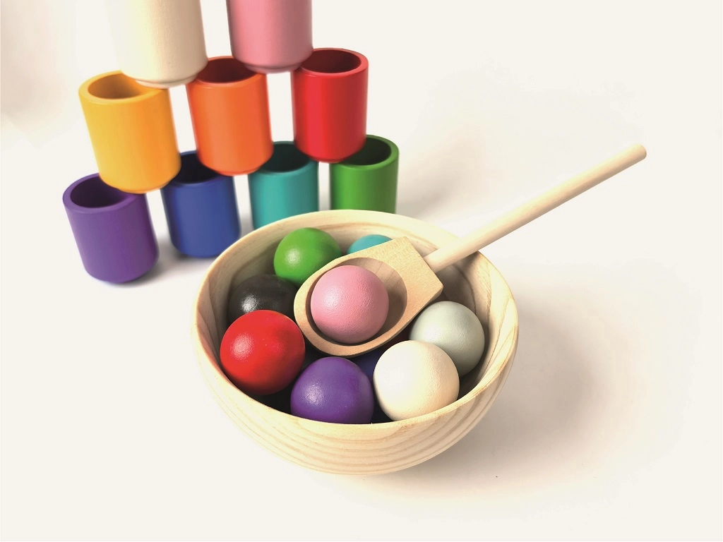 Komplet uključuje zdjelicu, žlicu, kuglice i čašice u 12 duginih boja. Zahvaljujući kvalitetnoj izradi od FSC drva, igračka je izdržljiva, sigurna i ugodna na dodir. Odlično za kućnu upotrebu i vrtiće.