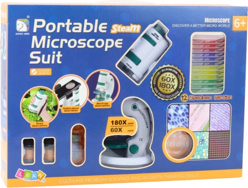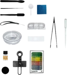 - Mini mikroskop, podesivi stativ s LED-om, remen za ruku, lupa, držač za telefon, 2× bočica za uzorke, trostruki inkubator sa stakalcima, posudica za preparat sa stakalcetom, pipeta, nožić, lopatica, štapić, pinceta, 12 gotovih preparata, 4 prazna stakalca, šareno pakiranje