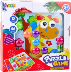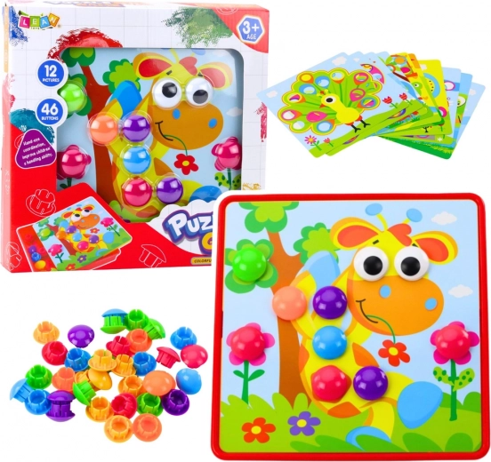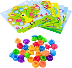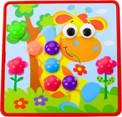 Ova kreativna mozaička igra spaja učenje i zabavu: djeca prema predlošcima ili uz vlastitu maštu stavljaju šarene gumbe u otvore te tako vježbaju logičko razmišljanje i strpljenje. Zahvaljujući šarenoj paleti boja i simpatičnim motivima rado joj se vraćaju – a pospremanje je jednostavno zahvaljujući praktičnom organizeru.