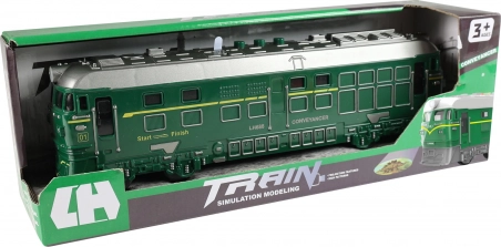 Zelena lokomotiva sa svjetlom, zvukom i projektorom. Inercijski pogon, duljina 33 cm. Baterije AG13 su uključene u pakiranje – spremno za trenutačnu igru.