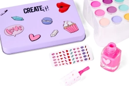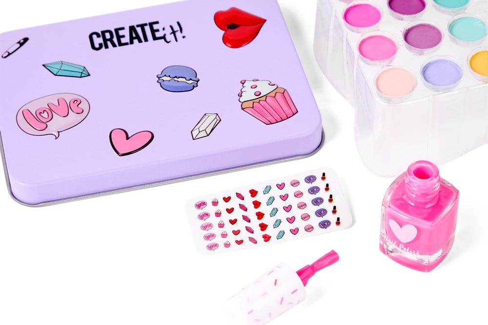 Ovaj dječji kozmetički set donosi sigurnu i zabavnu ulaznicu u svijet šminkanja. Zahvaljujući različitim bojama sjenila i lakova, djeca mogu stvarati bezbroj šarenih kombinacija i razvijati svoj estetski senzibilitet. Limena kutija štiti sadržaj i ujedno služi kao praktična i stilska kutija za pohranu.