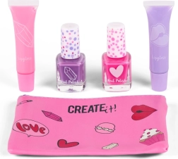 Stilizan make-up set s kozmetičkom torbicom idealan je za mlade djevojke koje žele sigurno istraživati svijet šminkanja. Sadrži 2 sjajila za usne (6,2 ml), 2 laka za nokte (5 ml) i praktičnu kozmetičku torbicu za jednostavno odlaganje. Proizvodi su prilagođeni dječjoj koži, lako se nanose i zahvaljujući kompaktnim dimenzijama odlični su za kuću i putovanja.