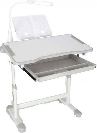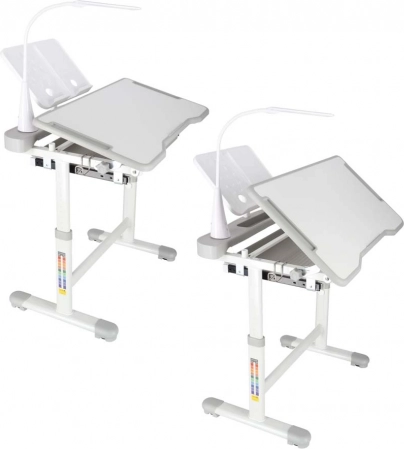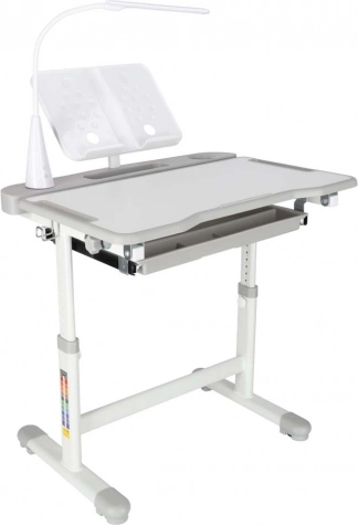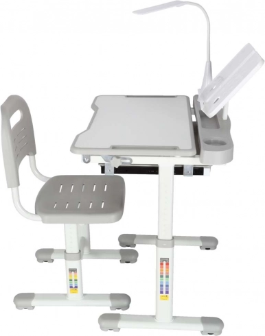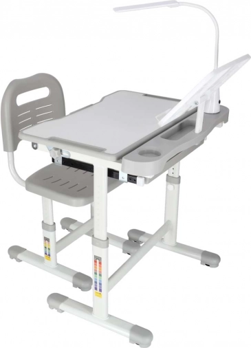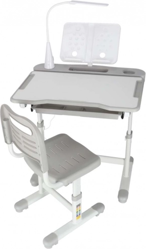 Praktičan dječji pisaći stol sa stolicom i USB LED lampom u sivoj boji stvara ergonomsko i uredno mjesto za učenje i kreativni rad. Visinu stola i stolice moguće je glatko prilagoditi rastu djeteta, a tu su i nagibna radna ploča, velika ladica s organizatorom, držač za torbu, mjesto za čašu i stalak za knjigu. LED lampica nudi 3 režima svjetla i 3 razine svjetline za pravilno osvjetljenje danju i noću.