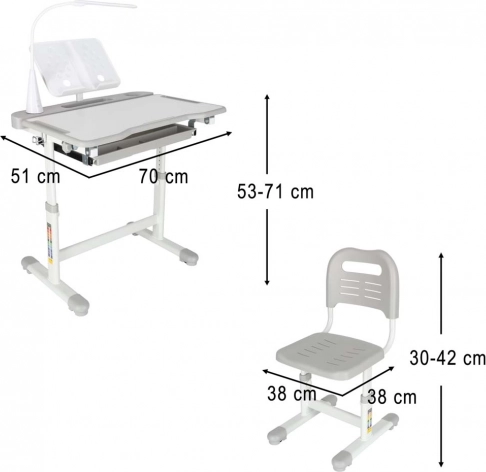 - Rastuća konstrukcija: regulacija visine stola (53–71 cm) i sjedala stolice (30–42 cm)